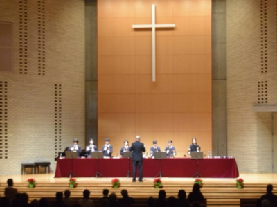 12/13(土)午後、第35回横須賀ファミリークリスマスが横須賀学院・大チャペルで行われ、中学・高校ハンドベル・クワイアが”O Come All Ye Faithful“(神のみ子はこよいしも)、”Joy To The World“(もろびとこぞりて)などを演奏しました。